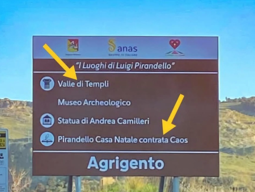 I viaggiatori che arrivano in città sono infatti accolti, lungo quella è chiamata ‘la strada degli scrittori‘, da un cartello turistico che indica la Valle ‘di’ Templi e la casa di Pirandello in ‘contrata’ Caos.