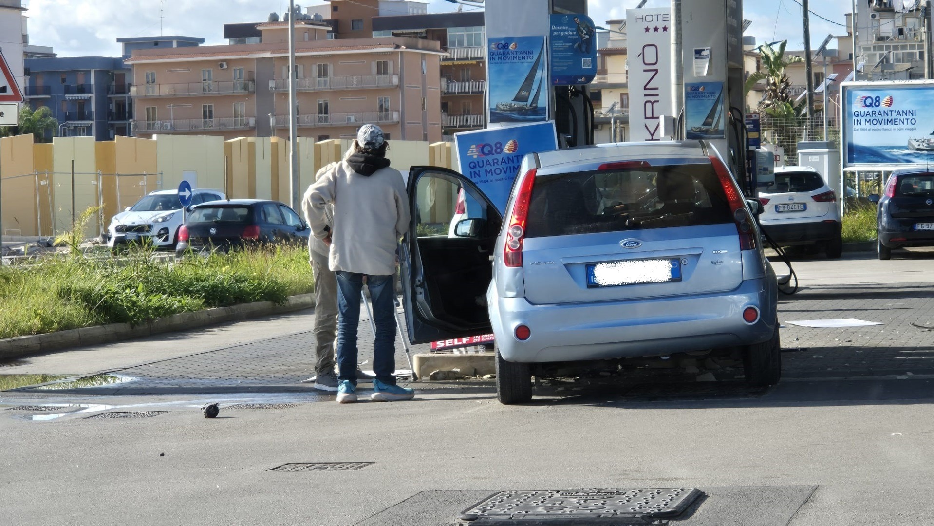 Una Ford Fiesta con due uomini a bordo si è schiantata contro una pompa di benzina all’interno dell’area di servizio Q8 di Augusta scardinando gravemente la base in muratura della colonnina e causando una leggera fuoriuscita di carburante dalla base della pompa.