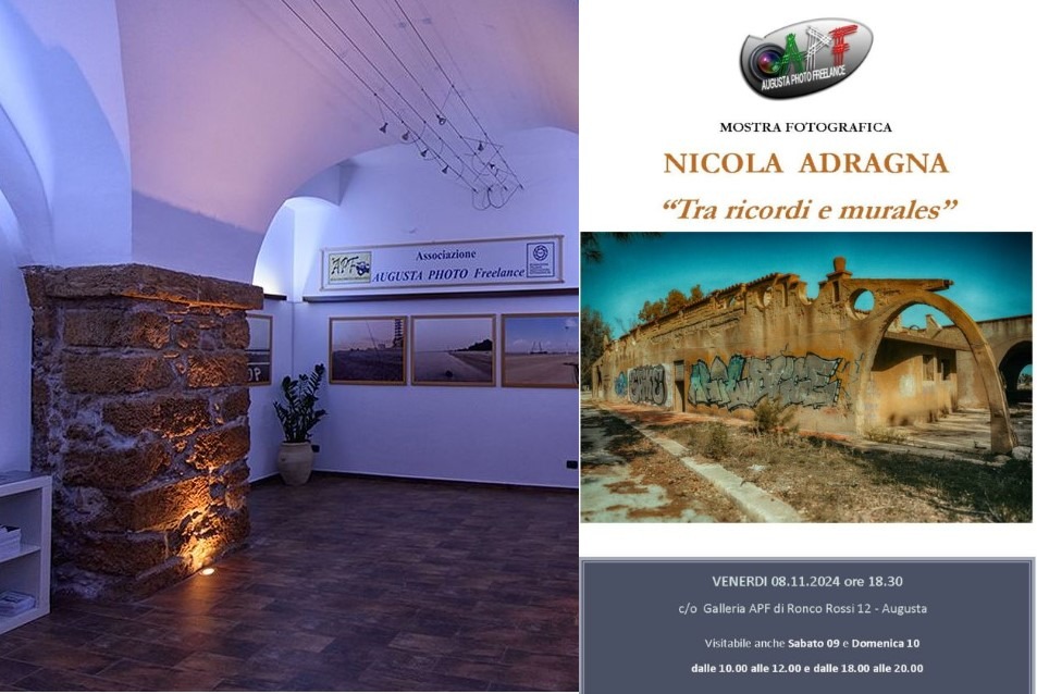 Da domani la Galleria Fiaf/Apf di Augusta ospiterà la personale fotografica “Tra ricordi e murales” di Nicola Adragna. L’inaugurazione prevista per oggi alle 18, 30 è stata rinviata di 24 ore per previste avverse condizioni meteo.