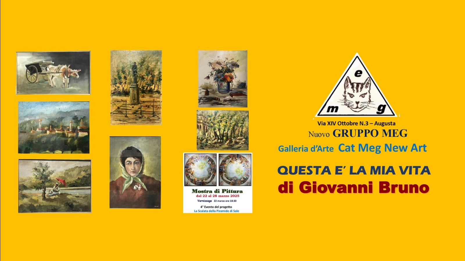 Il Gruppo Meg –Galleria d’arte Cat Meg New Art presenta la mostra di pittura di Giovanni Bruno “Questa è la mia vita” che sarà allestita nei locali della galleria di via XIV Ottobre al civico 3 da domani 22 marzo al 28 marzo.