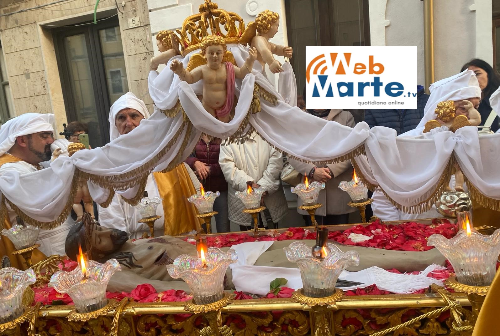 La processione con il simulacro del Cristo morto, adagiato nell’urna ricoperta di camelie, sta attraversando, seguita dalle telecamere di Webmarte, le vie del centro storico per fare ingresso in ogni chiesa dove è stata esposta solennemente l’Eucarestia.