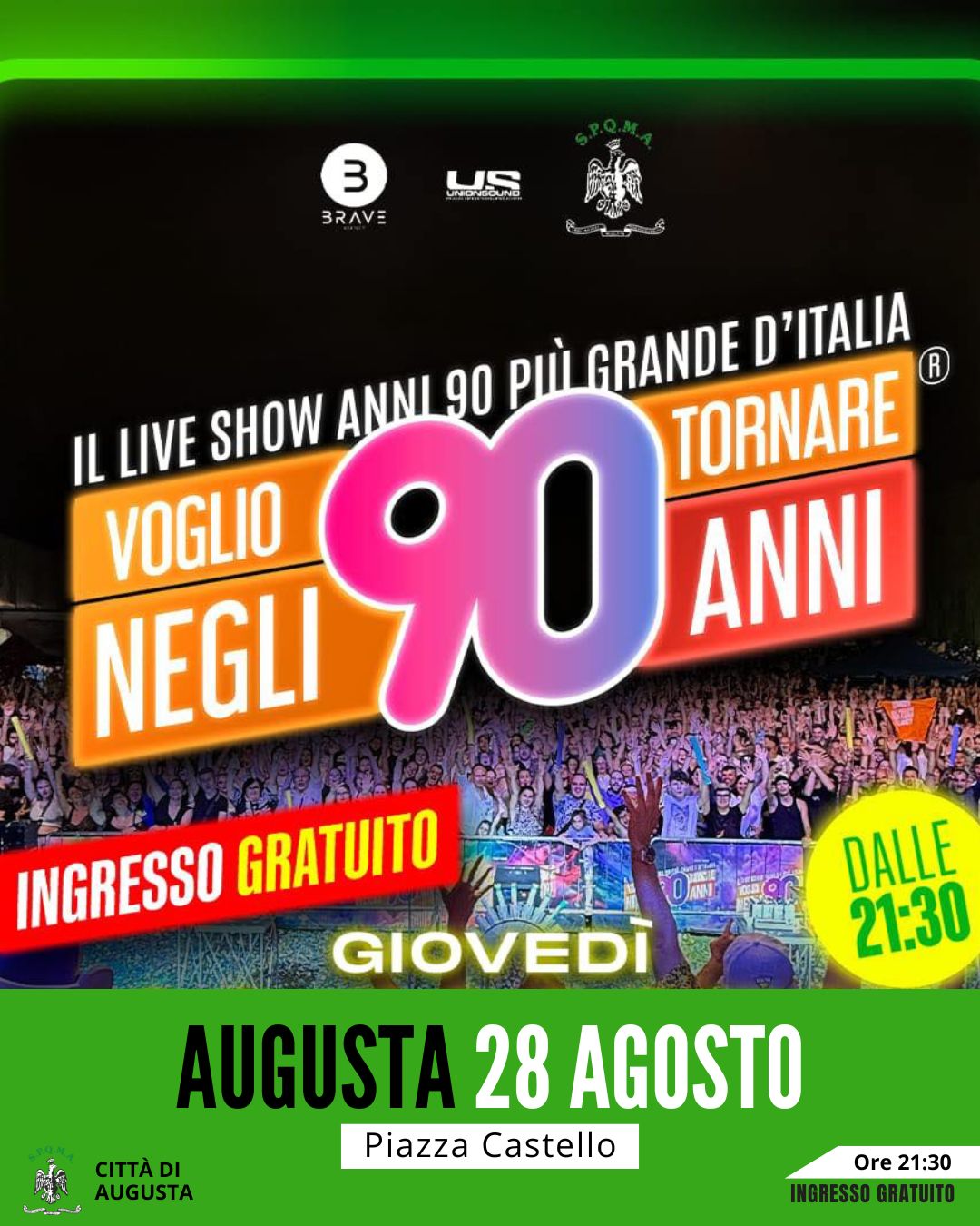 Colori fluo, hit indimenticabili, mascotte iconiche e un’energia travolgente: è questo il mix esplosivo di “Voglio tornare negli anni ’90” è il format-evento che sta conquistando migliaia di spettatori in tutta Italia.