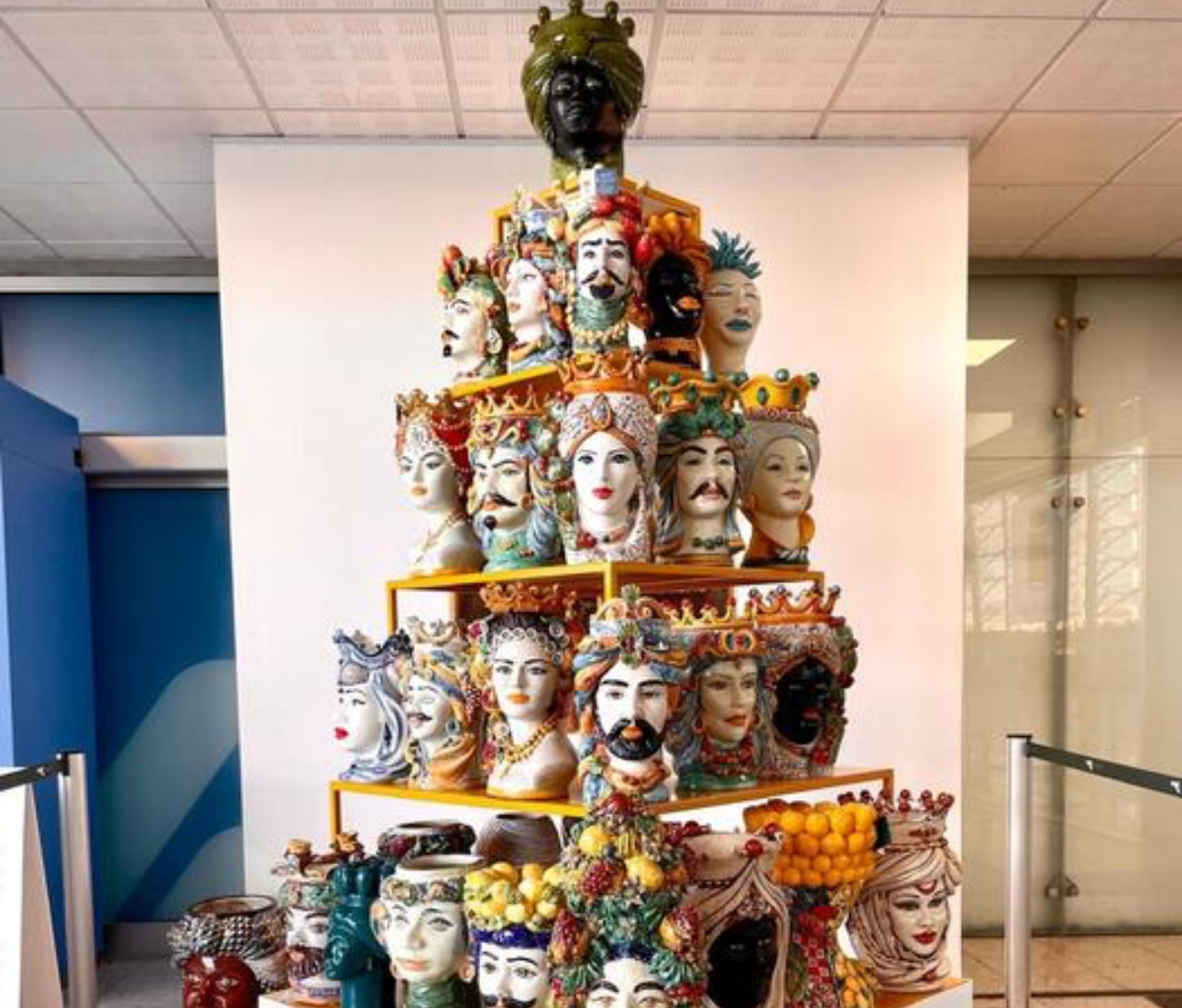 L’aeroporto di Catania celebra il Natale con un’installazione che unisce tradizione e arte siciliana. Al posto delle tradizionali decorazioni natalizie, è stato allestito un albero di Natale realizzato con le celebri “Teste di Caltagirone”, opere uniche create dai maestri dell’associazione “I Ceramisti”.