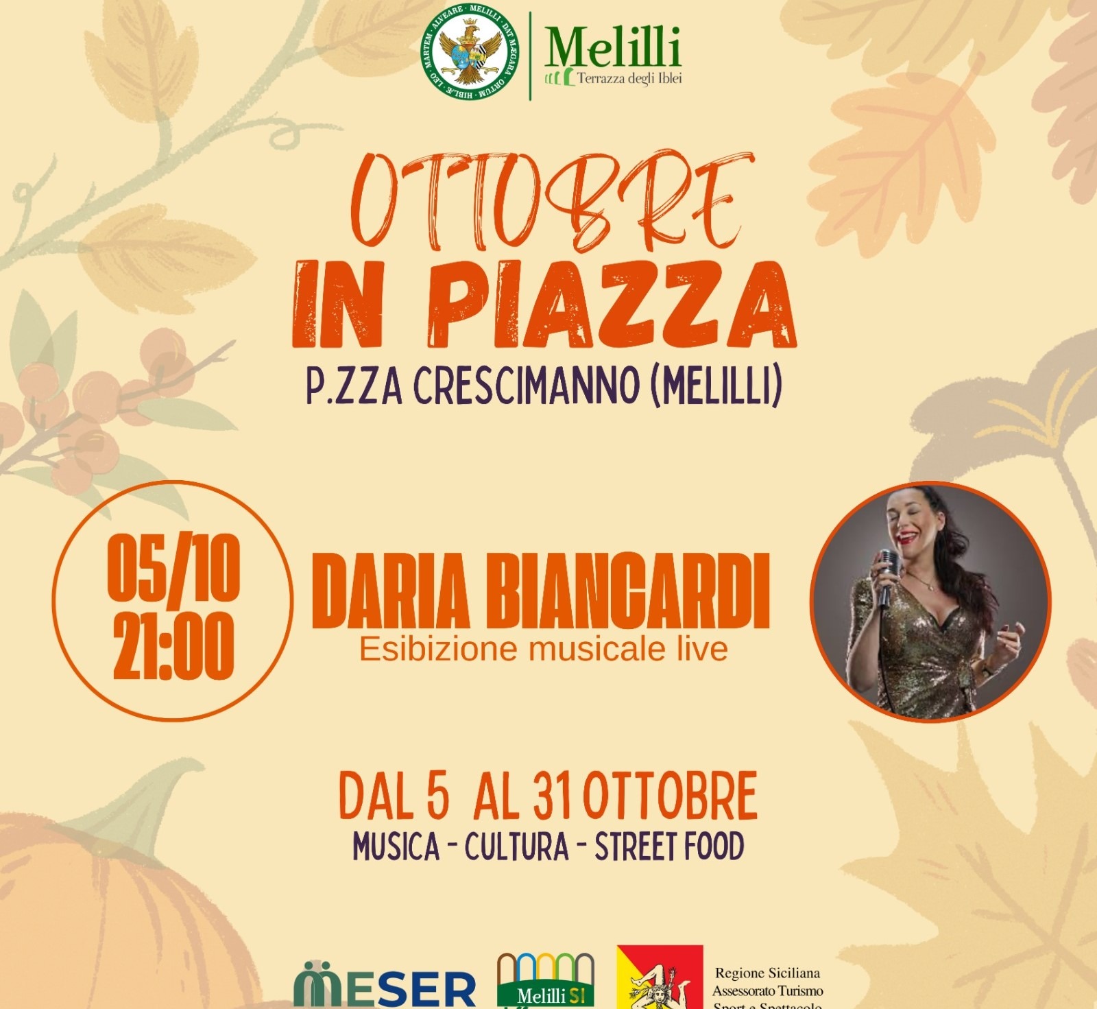 Sabato 5 ottobre, nel salottino di Piazza Crescimanno, con lo sfondo del Palazzo Municipale, ci sarà lo spettacolo assicurato della cantante Daria Biancardi.