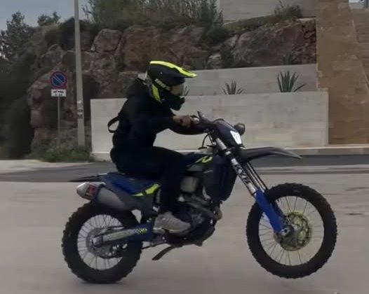 Con la moto da cross all’interno dell’area pedonale, tra i passanti, scendendo pure i gradini con la due ruote.
