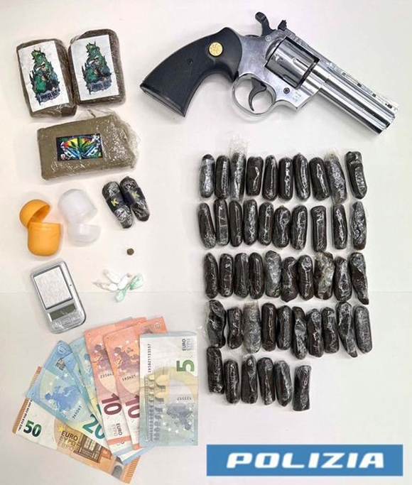 Nel medesimo scenario operativo, gli investigatori operavano, altresì, una perquisizione domiciliare presso l’abitazione del trentaquattrenne, già sottoposto agli arresti domiciliari, che, alla vista di Poliziotti, tentava di disfarsi di 4 ovuli di hashish e di un ovulo di cocaina, lanciandoli dalla finestra. La droga veniva sequestrata, unitamente ad altro stupefacente ritrovato all’interno della casa insieme a 135 euro, probabile provento dell’attività di spaccio e una pistola a salve, priva di tappo rosso.