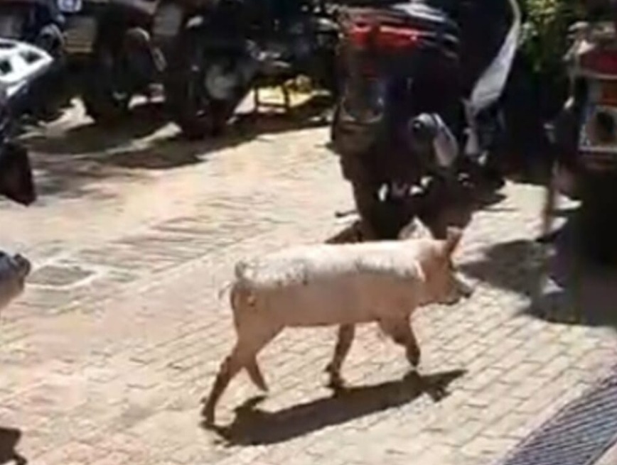 Probabilmente per lo scossone dovuto a una buca nella sede stradale, una barra laterale di contenimento ha ceduto, facendo cadere sulla strada i tre maialini che, correndo, hanno tentato la fuga cercando rifugio dentro l’assessorato.