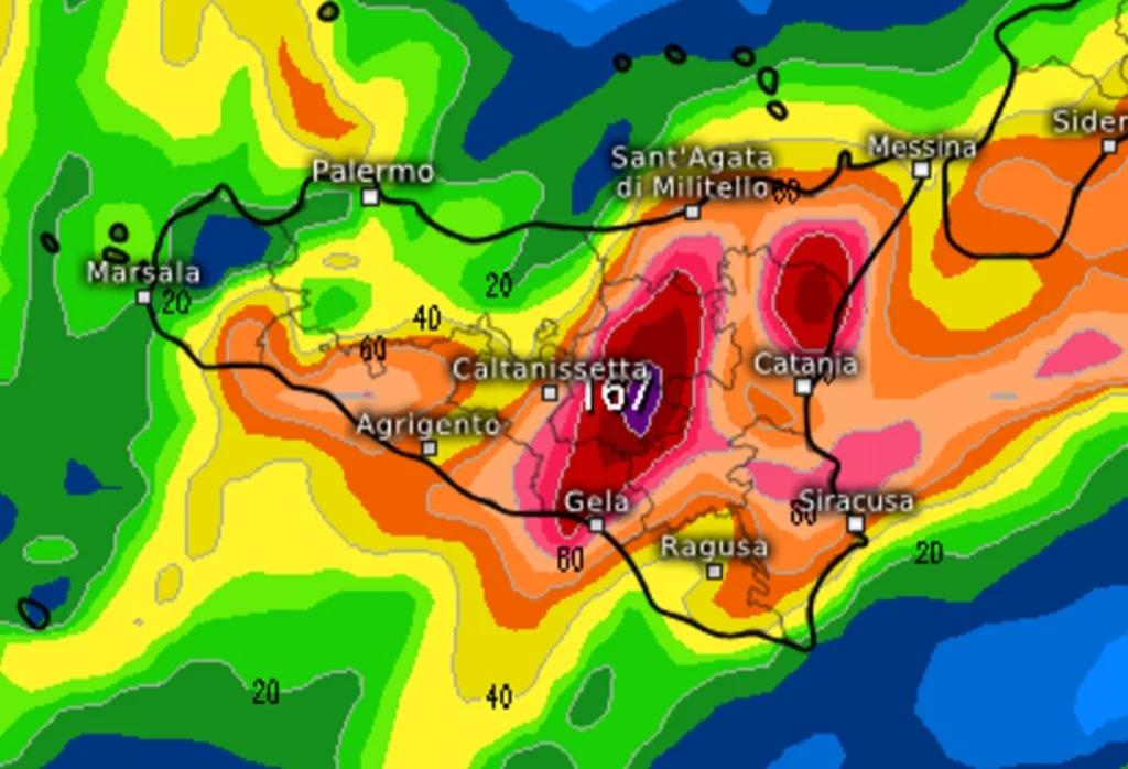 Il cielo sarà molto nuvoloso o coperto, con piogge intense e persistenti che potrebbero raggiungere accumuli significativi tra 40 e 80 mm. Le zone più esposte saranno il Trapanese, il sud del Palermitano e l’Agrigentino, dove non sono esclusi temporali forti o veri e propri nubifragi.