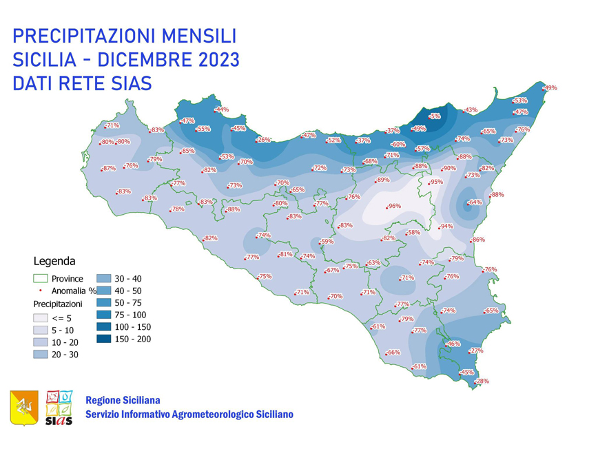 Tutte le stazioni della rete SIAS, con la sola eccezione di Pantelleria, hanno registrato accumuli inferiori alla norma del periodo, con lo scarto percentuale più accentuato, -96%, presso la stazione Agira.