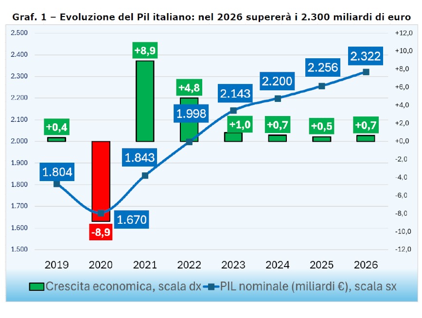 Nel 2026 il Prodotto interno lordo nazionale, in termini nominali, supererà i 2.300 miliardi di euro, con un incremento di 66 miliardi pari al +2,9 per cento rispetto al dato del 2025.