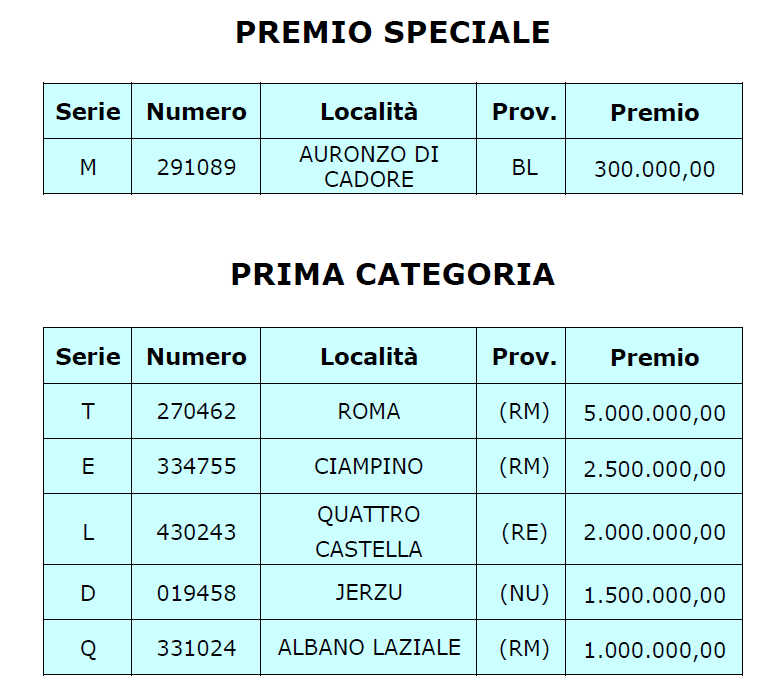 Il terzo biglietto estratto, al quale va il premio di 2 milioni, è stato venduto a Quattro Castella, in provincia di Reggio Emilia, il quarto premio di 1,5 milioni è andato a Jerzu, in provincia di Nuoro e il quinto, del valore di 1 milione è andato a un biglietto venduto ad Abano Laziale, ancora in provincia di Roma.