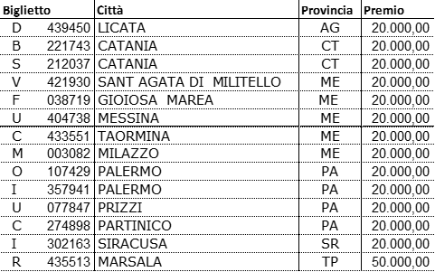 Gli altri premi, tutti da 20 mila euro, vanno: 5 in provincia di Messina e 4 in quella di Palermo, 2 in provincia di Catania e uno ciascuno in quelle di Agrigento e di Siracusa.