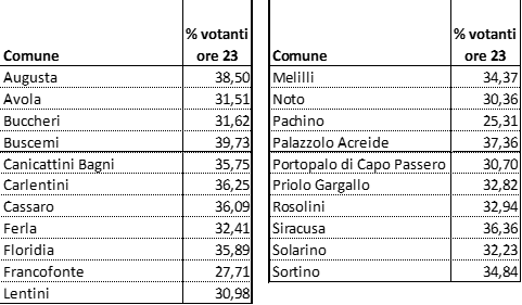 Questa l’affluenza nei comuni della provincia alle 23 di ieri.