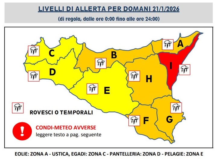 Ritorna arancione (preallarme) l’allerta meteo domani, mercoledì, 21 gennaio, in provincia di Siracusa mentre rimane al livello più alto, il rosso, nella zona fra Catania e Messina.