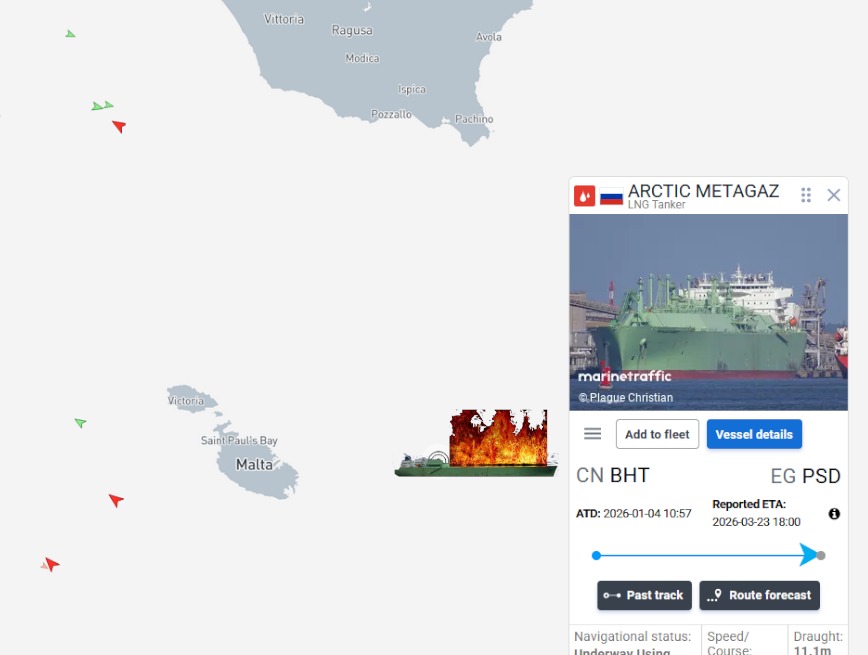 La nave cisterna Artic Metagaz, che farebbe parte della flotta ombra russa, è in fiamme nel Canale di Sicilia al largo di Malta e circa 50 miglia a sud di Capo Passero.