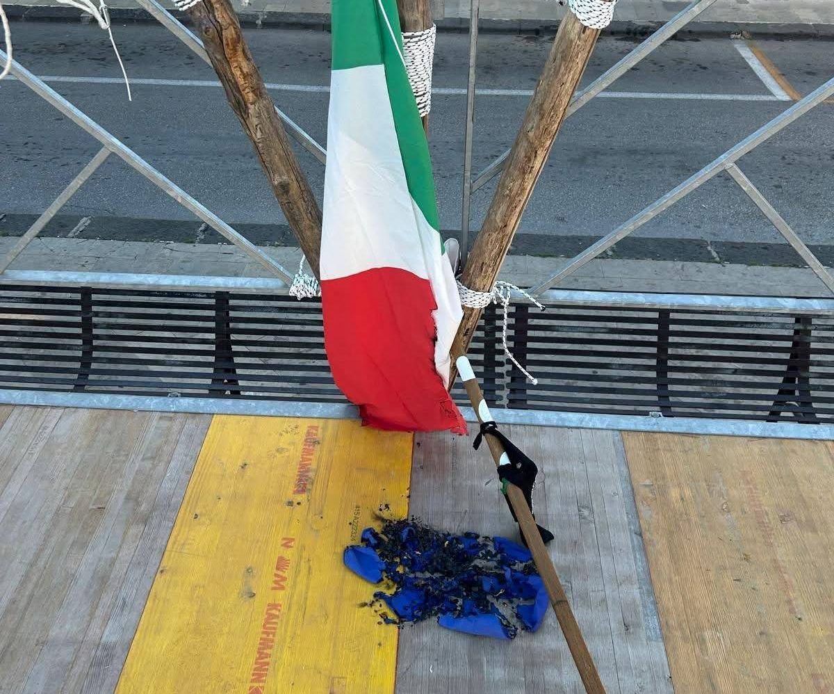 Danneggiata nella notte a Solarino la bandiera italiana e bruciata quella europea.