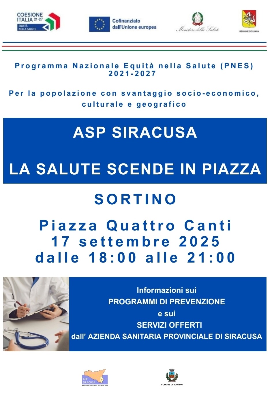 In occasione della festa dell’ottava di Santa Sofia a Sortino, mercoledì 17 settembre dalle 18 alle 21, l’Asp di Siracusa sarà presente in piazza Quattro Canti con una postazione dedicata alla promozione della prevenzione oncologica e alla diffusione di informazioni sulle opportunità offerte, in termini di servizi sanitari, anche a favore delle fasce di popolazione più svantaggiate.