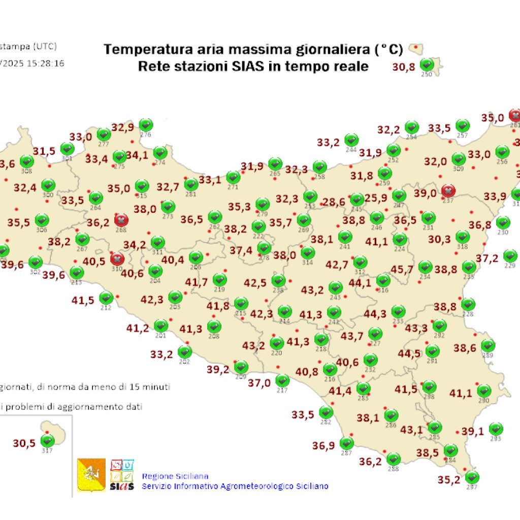 L’ondata di caldo che da alcuni giorni ha colpito la Sicilia sembra dare i primi segnali di tregua. Le temperature massime registrate oggi dalla rete del Sias, salvo qualche eccezione, sono tutte sotto i 40°. A Francofonte, dove ieri il termometro aveva toccato i 44,5°, la colonnina del mercurio si è fermata a 37,9°, a […]